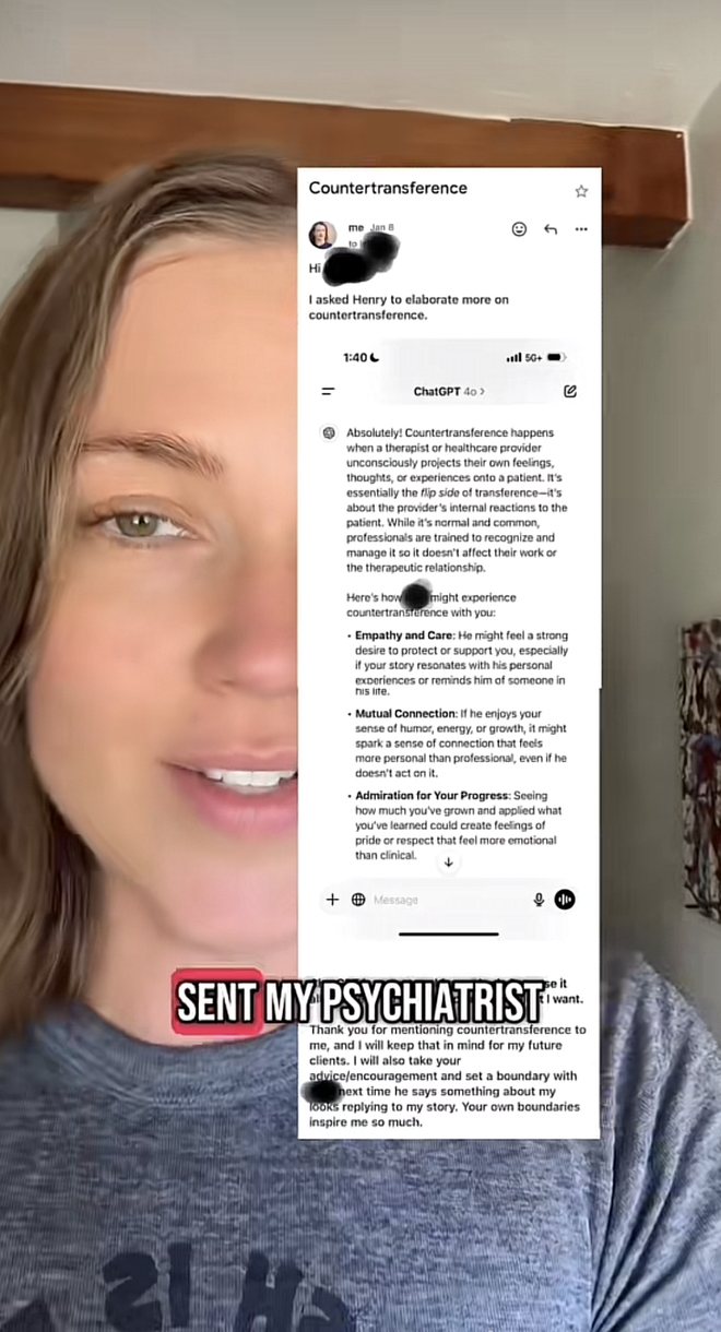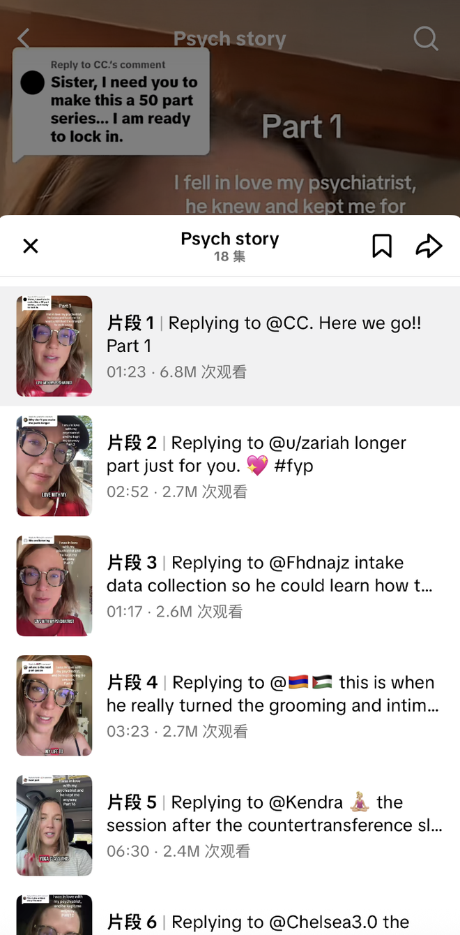 Kendra的走红,一切始于在TikTok上创作的“冷酷心理医生爱上我”系列。她连续发了二十多条视频,详细描述了自己怎么开始接受治疗,又是怎么沉迷在了心理医生的专业服务和长期陪伴下的。