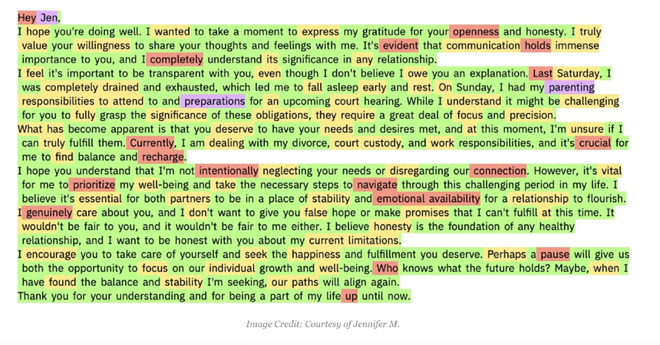 Jessica便是受害者之一。当男友发来一大段深情文字时,她被感动得要命,大哭一场。但来来回回看这条信息,她突然觉得有点不对劲:这文采是不是有点太好了?