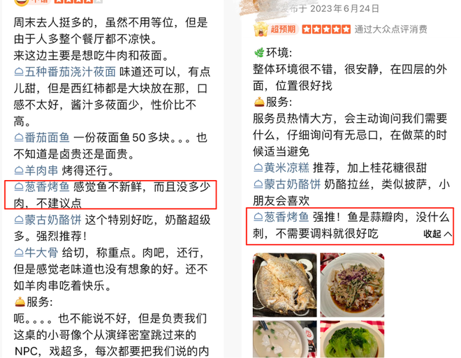 在大众点评上,这家店里消费者对这道菜的口味评价里,褒贬不一,有顾客留言称“感觉鱼不新鲜,没多少肉,不建议点”,有的顾客称“强推!鱼是蒜瓣肉,没什么刺,不需要调料就很好吃”。