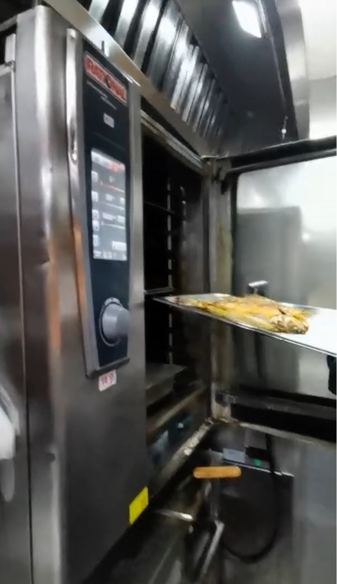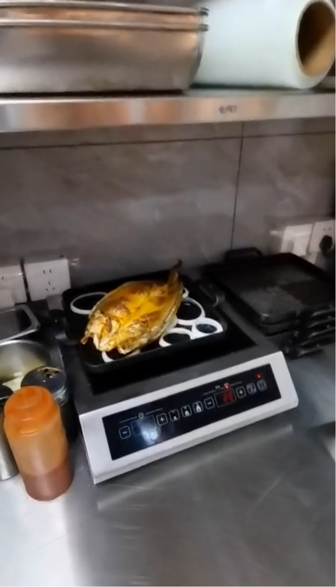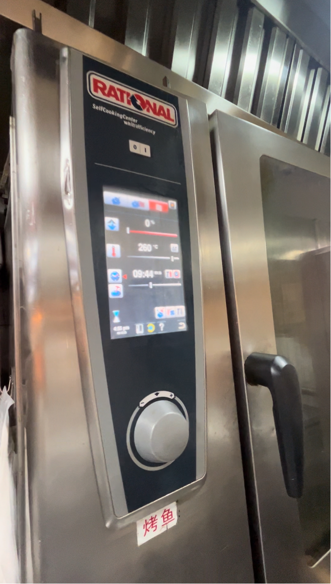 接着鱼被放置入烤箱中,在260度高温下烤10分钟。不少消费者传统认知中的“烤鱼”,出自火烤,对烤箱较为陌生。厨师长解释,每个地方的工艺不一样。