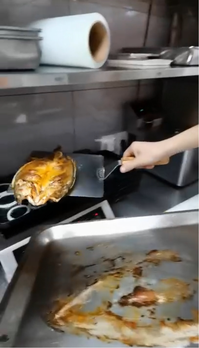 厨师长解释,“要烧一下铁盘,铁盘是凉的,保证菜品的温度”。被问及顾客发现铁盘是凉的,会不会更倾向认为烤鱼是直接放上来的(指放入铁盘)?“会有这种情况吧”,厨师长回答。