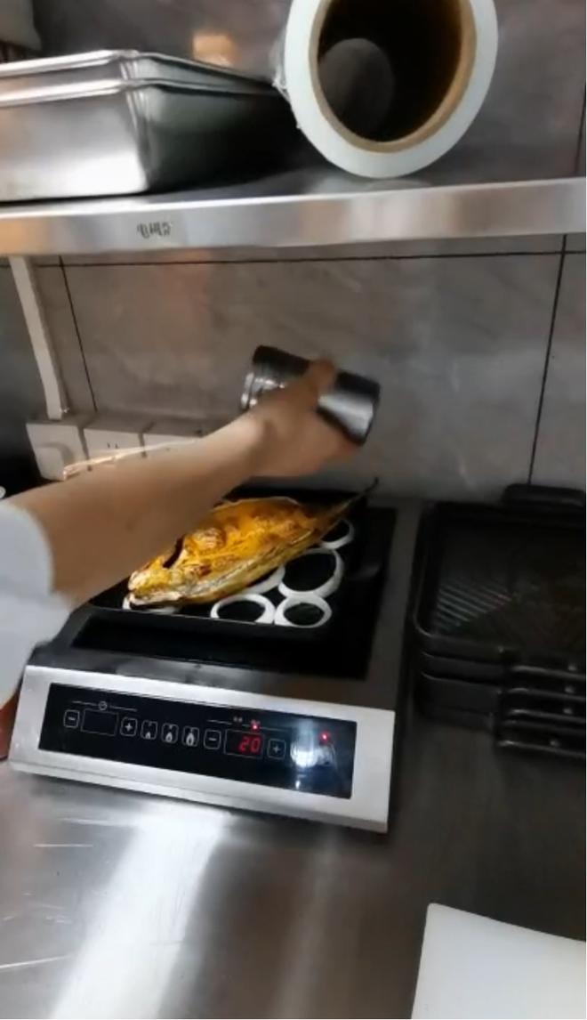 厨师长撒上调味料,并同步加热。为什么还要将烤鱼加热一次?