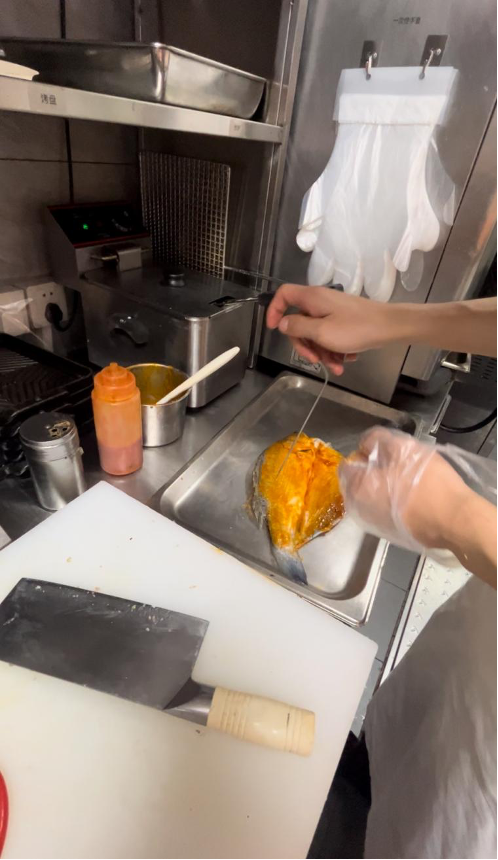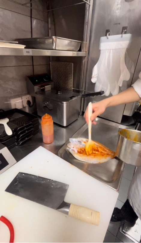 随后,后厨员工将鱼置于案板上,刷上一层辣酱,厨师长介绍,辣酱是在市场上统一的供应商购买,如果制作的是免辣口味,用的酱料则不同。“这层酱料主要为烤鱼提供一个基础的底味”。
