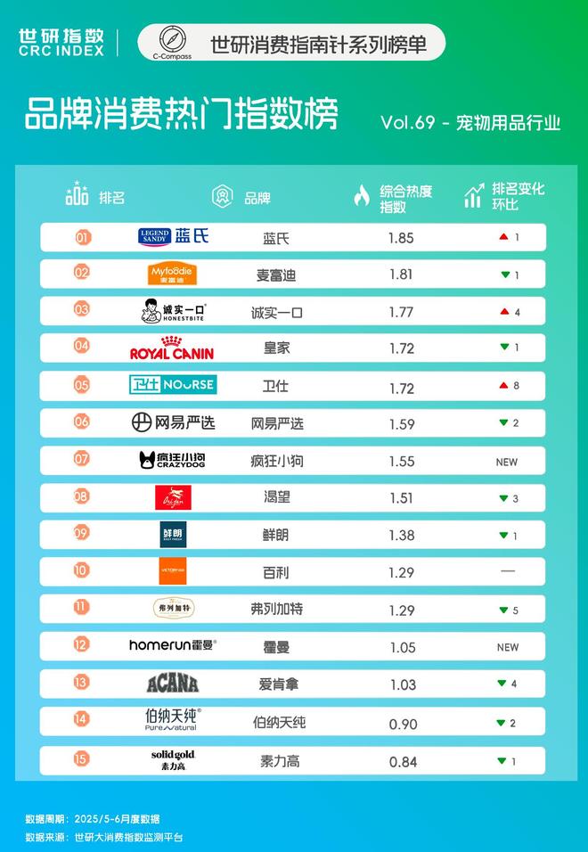 本次监测周期内,宠物品牌蓝氏、麦富迪、诚实一口以1.85、1.81和1.77的综合热度位列榜单综合热度前三。