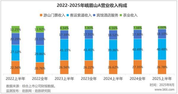 2025上半年年,峨眉山A主营业务中,游山门票业务收入占总收入比重为26.78%,客运索道为40.48%,宾馆酒店服务为18.10%,茶叶收入为6.00%。