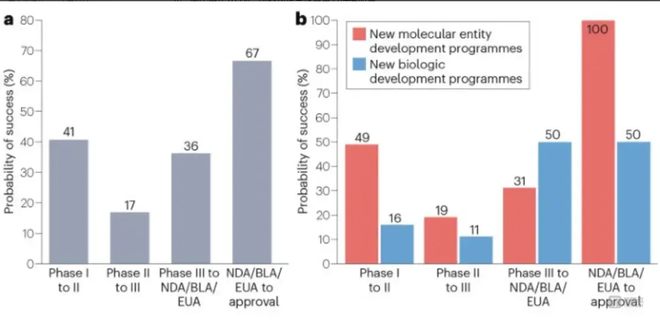 Success Rates of Chinese Innovative Drugs in U.S. Clinical Trials: a. Success rates by clinical phase; b. Success rates by drug type in each phase