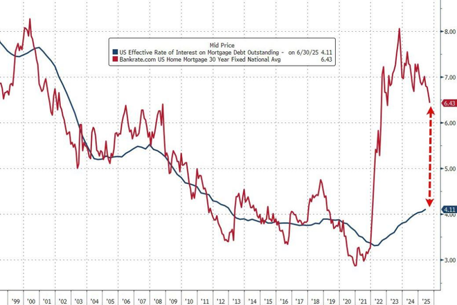 (美国未偿还贷款的实际抵押贷款利率为4.11%,新增30年期抵押贷款利率超过6.43%)