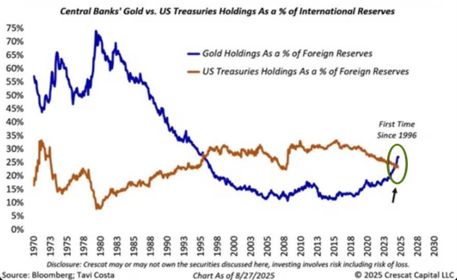 Schiavone指出,一个关键的结构性信号是,三十年来外国央行持有的黄金首次超过美国国债,这不禁令人联想到布雷顿森林体系崩溃前夕的1960年代末期,当时欧洲各国央行纷纷质疑美元地位并涌入黄金。这一转变直接反映出市场对美国政府债务的信任度正在被侵蚀。