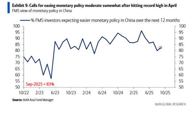 这一转变的背后,是对后续政策支持的强烈预期。调查显示,83%的基金经理预计中国未来12个月的货币政策将更加宽松,虽然该比例较4月的历史高点有所回落,但仍处于高位水平。