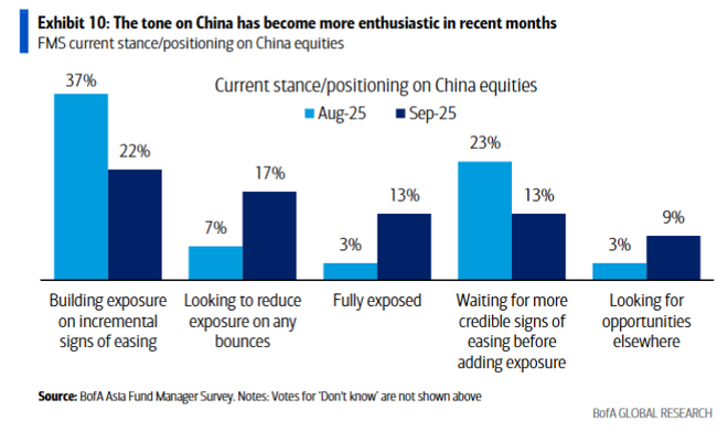 同时,投资者的行动正变得更为积极。相比8月,9月受访基金经理“已满仓 (Fully exposed)”中国市场的比例从3%大幅增至13%。观望阵营也明显萎缩,“等待更可靠的宽松信号再加仓 (Waiting for more credible signs)”的比例从23%降至13%。