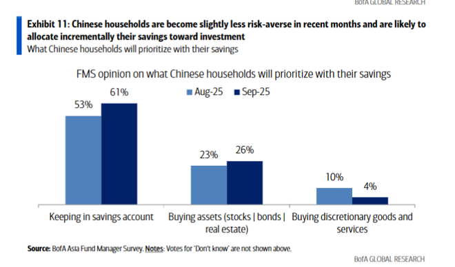 不过,认为家庭会购买股票、债券或房地产等资产的比例从23%微升至26%。美银据此认为,中国家庭的避险情绪略有下降,可能将增量储蓄逐步配置于投资。