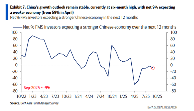 数据显示,仅9%的受访基金经理预期中国经济在未来12个月内走弱,较4月份的59%大幅改善,中国增长预期已升至6个月高点。相比8月,9月“满仓”中国市场的比例从3%大幅增至13%。观望阵营也明显萎缩,比例从23%降至13%。