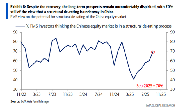 调查发现,高达70%的受访者依然认为,中国股市正在经历一个“结构性去评级”的过程。报告同时指出,尽管情绪回暖,基金经理在亚太地区的整体配置中对中国股票仍持净低配(-26%)立场,仅高于泰国和印度尼西亚。