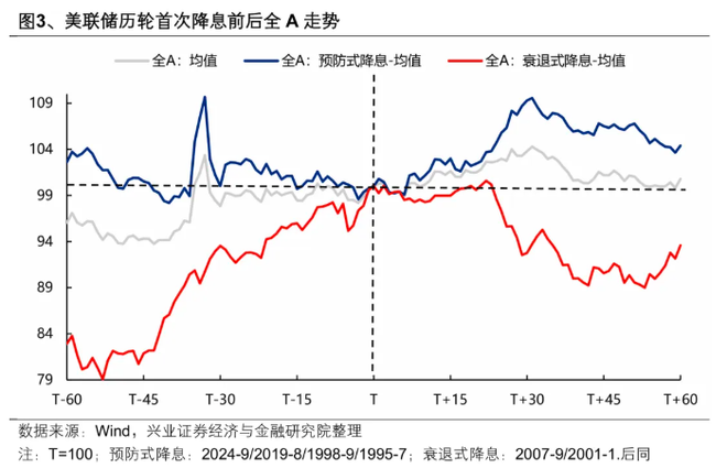 兴业证券特别对比了“预防式降息”和“衰退式降息”下中国市场的不同表现: