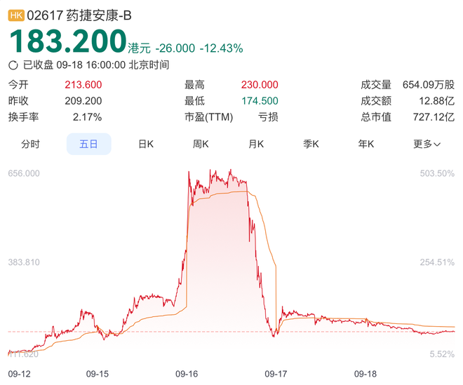 药捷安康,这家上市不足三个月的生物科技公司,在9月16日一度大涨63%、股价冲高到679港元/股,市值逼近2700亿港元巅峰后,午后股价闪崩,股价下跌54%,市值缩水至762亿港元。