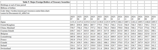 美国财政部周四公布的数据显示,外国投资者在7月持有的美国国债总额升至9.159万亿美元,连续第三个月创下历史新高。日本和英国是本轮增持的主要力量,而中国则降至2008年以来最低持仓水平。
