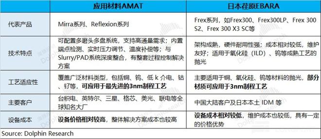 将两家公司的 CMP 产品进行对比,可以看出应用材料 AMAT 的 CMP 设备更为领先。公司能提供 Mirra(专注于 150-200mm)、Reflexion(专注于 300mm)两大技术平台,基本可以满足各类型材料的需求,并能应用于最先进的 3nm 制程工艺,而日本 EBARA 的 CMP 产品只能适用于部分材质。