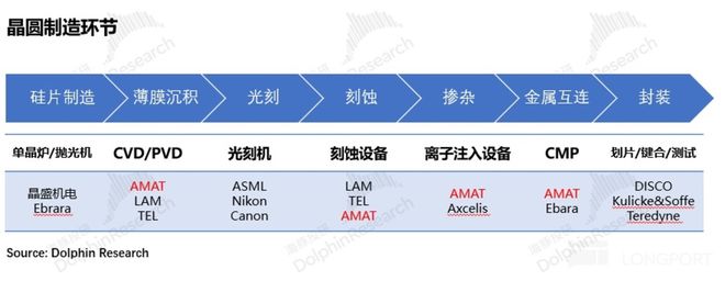 b)丰富完善的产品体系:在半导体制造环节中,应用材料 AMAT 能提供一系列的产品,包括扩散炉、刻蚀设备、CVD、PVD、ALD、CMP、离子注入设备等,覆盖了从材料的创建、成型到改性、分析等工艺步骤,是全球唯一能提供整线解决方案的设备商。