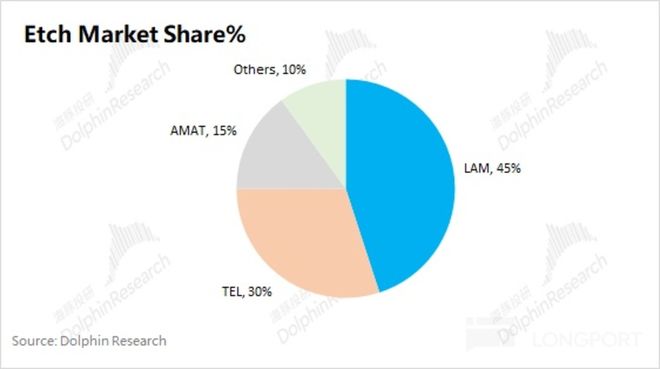 应用材料 AMAT 目前在刻蚀领域是追随者的角色,大致占据 15% 的市场份额。在刻蚀市场中,LAM 和东京电子都是市场的领先者。