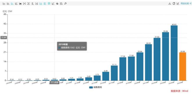 雷达财经注意到,在科大讯飞成为“标王”的一路上,公司的销售费用快速走高。Wind数据显示,2014年,公司销售费用还只有2.4亿元,十年后的2024年,这一数字已经来到40.83亿元。增长了超过16倍。