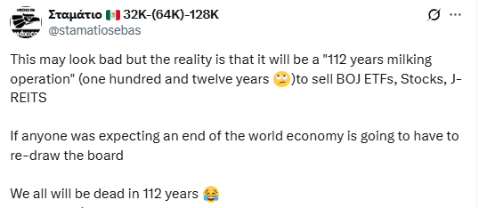 然而,抛售节奏相对温和。按照每年3300亿日元的抛售规模计算,这相当于每年略超过40亿美元,日均抛售额不到2000万美元。以当前速度,央行完全清空ETF持仓将需要112年时间。