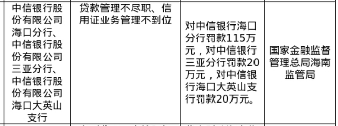 针对以上问题,国家金融监督管理总局海南监管分局对中信银行海口分行罚款115万元,对三亚分行、海口大英山支行各罚款20万元。