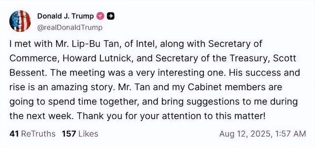 会谈的结果极具戏剧性。几天后,特朗普发帖盛赞陈立武。
