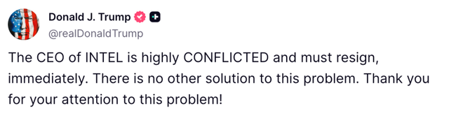 "英特尔的首席执行官存在严重利益冲突,必须立即辞职。"