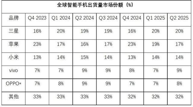 9月15日,Counterpoint发布数据显示,2025年Q2,全球智能手机出货量同比增长3%,实现连续第二个季度增长。苹果以17%的市场份额排名第二,同比大增11%。