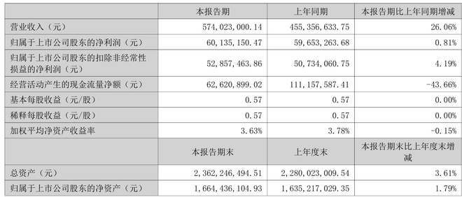 2025年上半年,公司营业收入约5.74亿元,同比增加26.06%;归母净利润为6013.52万元,同比增加0.81%;扣非净利润为5285.75万元,同比增加4.19%.