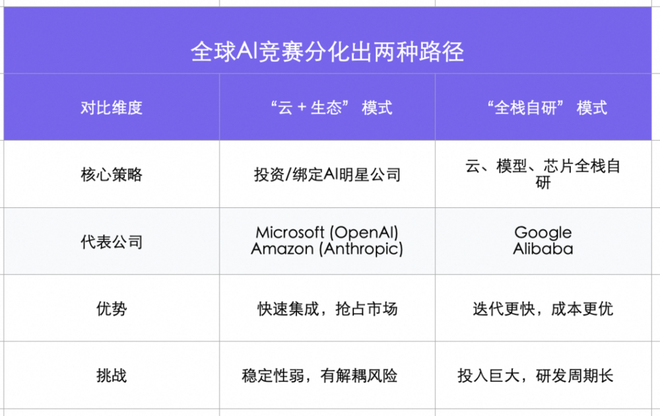 拿到“超级AI云”的入场券后,四家公司的战略路径出现了明显分化,主要体现在如何解决“模型”这一核心环节上,并由此形成了两种不同的模式。