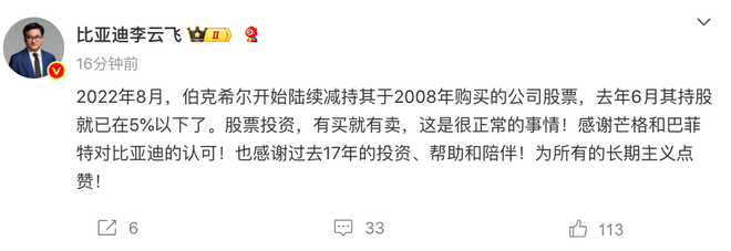 今天上午,比亚迪集团公关处总经理李云飞通过微博对此发文回应表示:2022年8月,伯克希尔开始陆续减持其于2008年购买的公司股票,去年6月其持股就已在5%以下了。股票投资,有买就有卖,这是很正常的事情!感谢芒格和巴菲特对比亚迪的认可!也感谢过去17年的投资、帮助和陪伴!为所有的长期主义点赞!