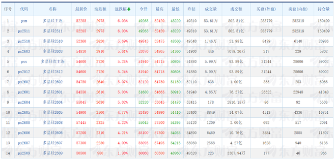 9月1日,广期所多晶硅期货价格全线大涨,主力合约PS2511收盘涨幅达6.03%,PS2510合约涨幅5.69%。