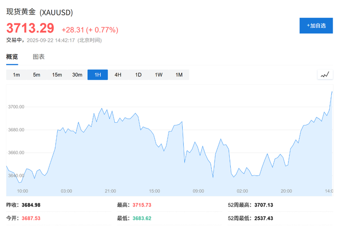 周一,现货黄金延续强势,5分钟内上涨5.96美元/盎司,报3714.37美元/盎司,续创新高。