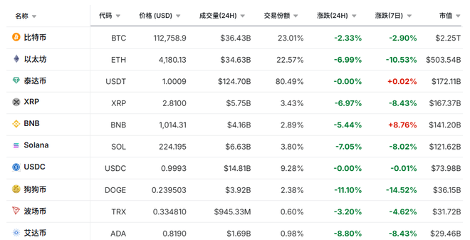 - 加密货币走低,比特币24小时跌幅超2%,以太坊24小时跌幅近7%,狗狗币24小时跌幅近11%,艾达币24小时跌幅超8%。