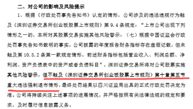 从《告知书》来看,公司股票将被实施其他风险警示,但不触及深交所规定的重大违法强制退市的情形;萦绕在公司身上的调查阴霾有望清空。