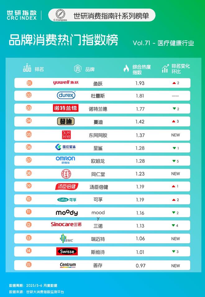本次监测周期内,鱼跃、杜蕾斯、诺特兰德分别以1.93、1.81、1.77的综合热度位列榜单前三,与后面品牌拉开差距。