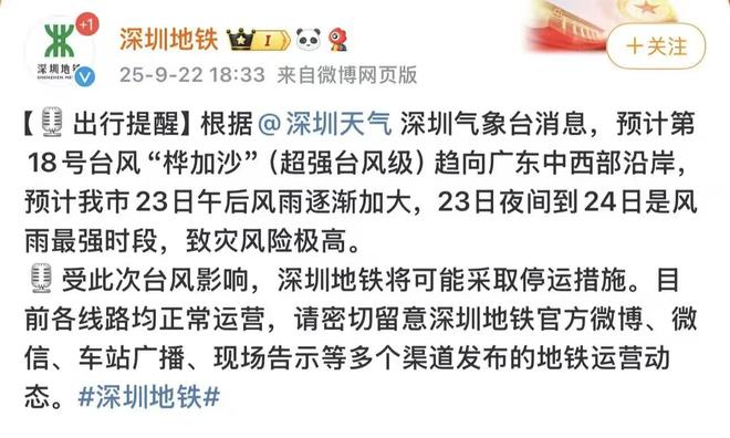 受此次台风影响,深圳地铁将可能采取停运措施。目前各线路均正常运营,请密切留意深圳地铁官方微博、微信、车站广播、现场告示等多个渠道发布的地铁运营动态。