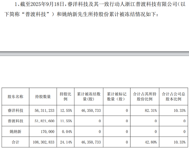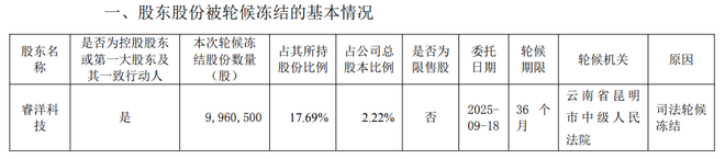 截至本公告披露日,睿洋科技共计持有公司股份5631万股,占公司总股本比例为12.55%。累计被冻结股份数量4635万股,占其所持有公司股份数量比例82.31%,占公司总股本的10.33%;累计被轮候冻结股份数量1704万股,占其所持有公司股份数量比例30.26%,占公司总股本的3.80%。