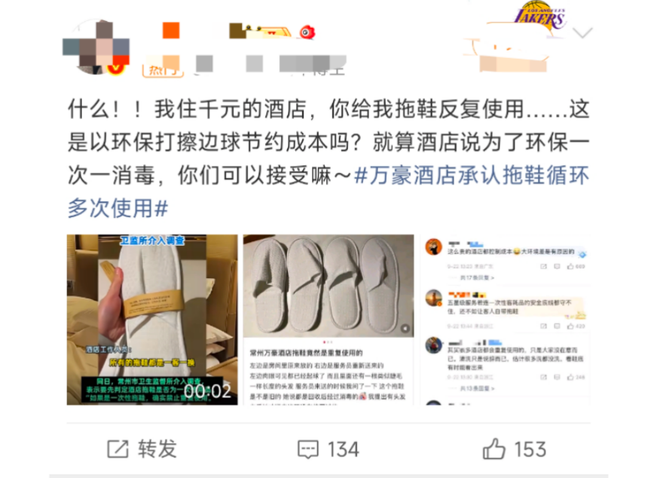 对此,酒店负责人解释称,酒店从未将拖鞋标注为一次性用品,因此回收清洗和循环利用属于正常操作,并声称其有规范的清洗消毒流程,类似于床单、被套等布草的“一客一换”标准。