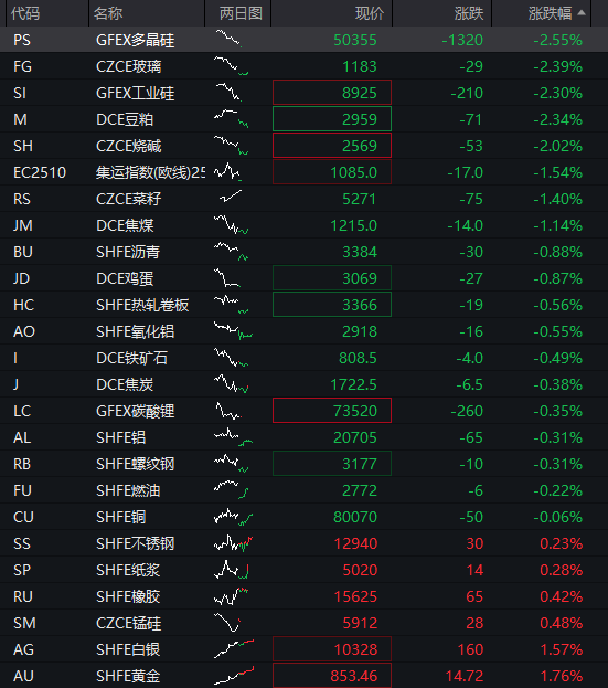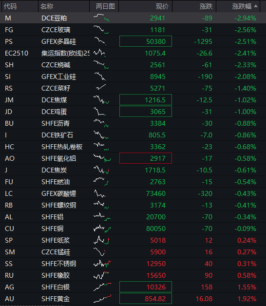 商品:国内商品期货普跌,截至发稿,豆粕、玻璃、多晶硅、集运指数、烧碱、工业硅等跌超2%,菜籽、焦煤、鸡蛋等跌超1%,铁矿石、沥青、热卷板、焦炭、燃油等下跌,仅有沪金、沪银等少数品种上涨。![]()