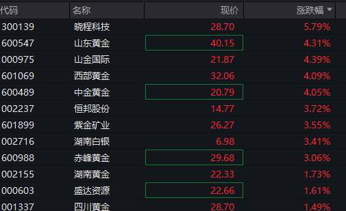 贵金属板块继续拉升,晓程科技涨超5%,山东黄金、山金国际、西部黄金等纷纷走高。