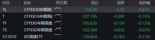 债市:国债期货全线下跌,截至发稿,30年期主力合约跌0.43%,10年期主力合约跌0.19%,5年期主力合约跌0.12%,2年期主力合约跌0.03%。![]()