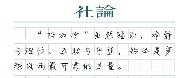 总之,超强台风考验的既是防灾体系的完备程度、各方与自然灾害赛跑的执行力,也是社会的凝聚力和稳健心态。“桦加沙”虽然猛烈,冷静与理性、互助与守望,始终是穿越风雨最可靠的力量。我们更应团结一致,政府、企业、社区、个人都应各司其职,调整到应急状态,全力应对、心中不慌,平稳度过这场狂风骤雨。