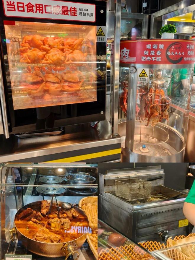 除了自营大单品,食品区也通过陈列设计凸显商品新鲜度与专业性:尤其是热厨鲜食区域均采用暖光灯陈列,烤鸡烤炉、烤鸭烤架持续旋转烤制,旁侧悬挂着刚出炉的烤鸭与烤鸡;消费者挑选炸物时,工作人员还会在现场操作间进行简单复炸后再打包。