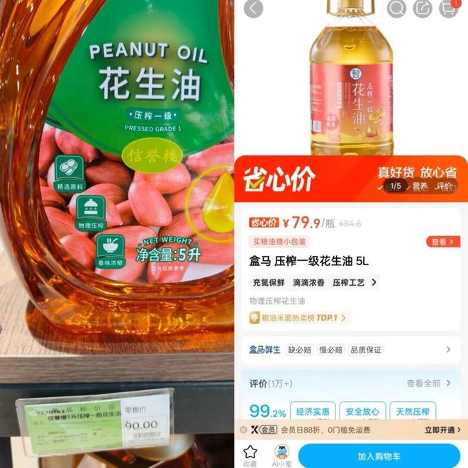 以信誉楼亚麻籽油为例,5L一桶售价119元,对比盒马MAX的有机亚麻籽油5L一桶售价110.9元;还有信誉楼的压榨一级花生油5L一桶售价90元,对比盒马自营的同款商品售价79.9元。