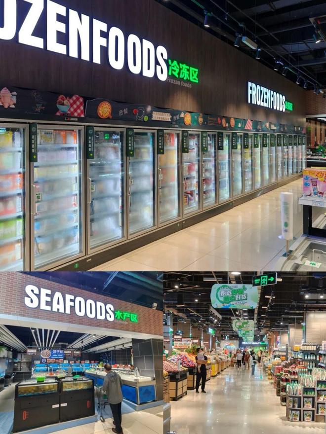 一进入店内,笔者就发现信誉楼超市使用了更明亮的暖光灯,这几乎是新商超的运营标配;入口处一整排明亮的冻品冰柜,还有不同分区门头所用的明亮招牌,更是凸显信誉楼超市运营设计的新鲜感。
