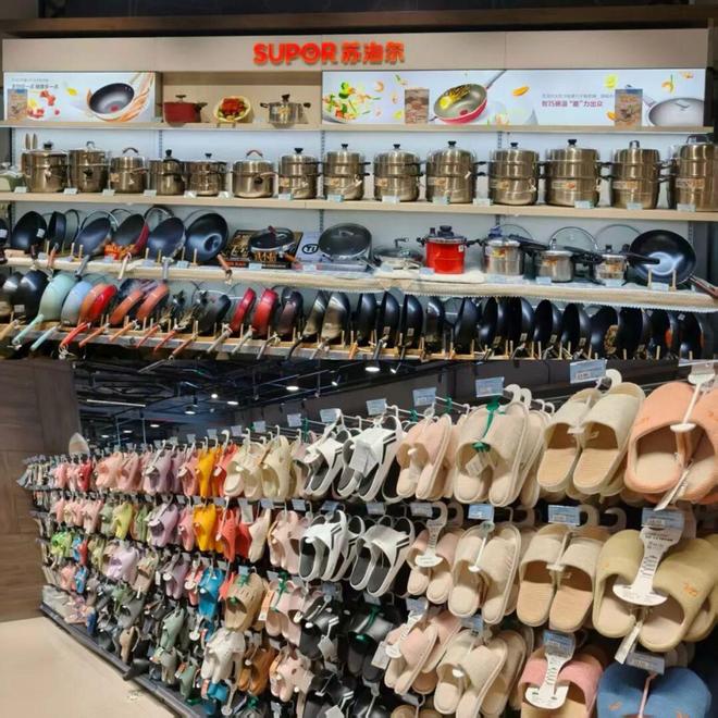 以信誉楼为例,其超市内仍有大面积货架陈列拖鞋、厨具炊具、扫把拖把等低频购买的生活用品。