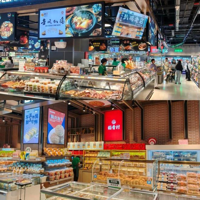 不过,迎合年轻消费者的购物新鲜感仅是一方面。当前新商超主推的两大板块:自营商品和热出鲜食,信誉楼超市内也均有呈现。
