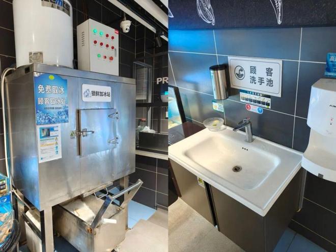 另一个细节是,水产区专门设置洗手台,方便消费者在挑拣海鲜产品后清理手部;同时还配备自助加冰区域,解决鲜货保鲜需求。